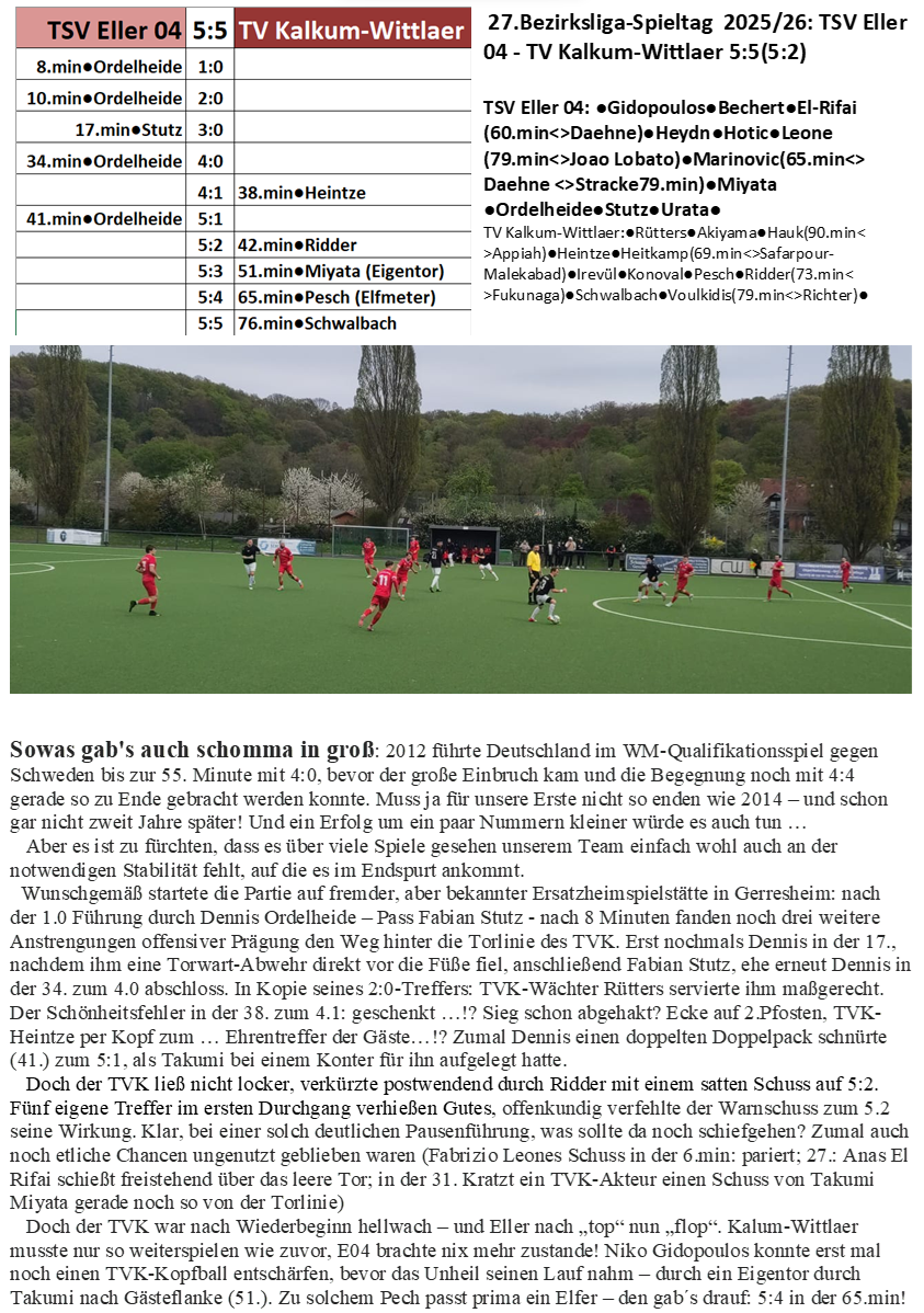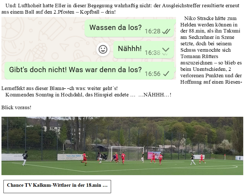 Ende also 0:0. Bei einer Mannschaft, die Tage zuvor schon Tabellenführer MSV Düsseldorf arg gefordert hatte (knappe 2:1-Niederlage). Und sollten dem MSV tatsächlich sechs Punkte wegen unerlaubtem Einsatz eines Akteurs aberkannt werden, dann … aber jetzt erstmal gegen den schwersten Gegner der Bezirksliga: nämlich den kommenden, den TV Kalkum-Wittlaer. Gütezeichen: zuletzt besagtem MSV Düsseldorf ein Unentschieden abgerungen!!!